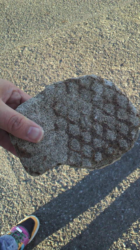 海で記念撮影、なんてしてたらタヌさんがたいやきのような石を見つける