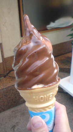 このチョコがけソフトですが、ソフトクリームを溶けたチョコの中へつけてくださるんですが、ソフトクリームがつぶれないかハラハラしました;