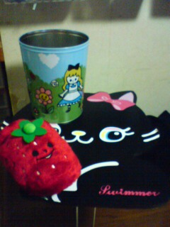 ってことでネコのテーブル、いちごの顔がついたスリッパ、原作の方のアリスの絵のゴミ箱を貰いました(>▽<)